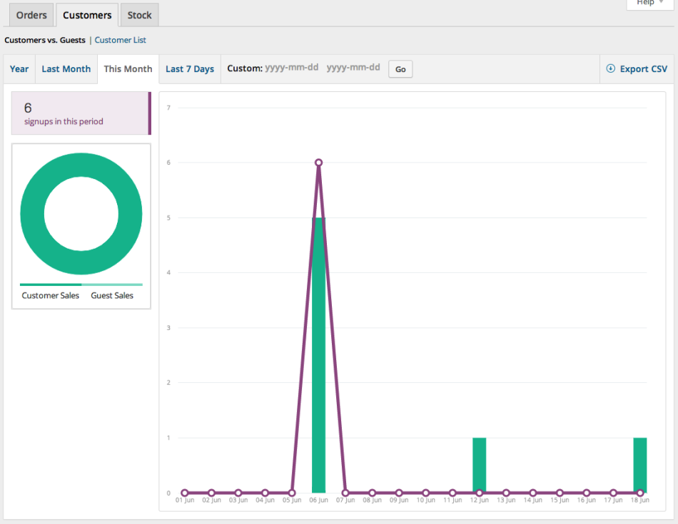下一个选项卡是用顾客vs访客和顾客列表选项查看顾客报表,以便按年、上个月、本月、过去7天和自定义的方式再次深入了解顾客信息。