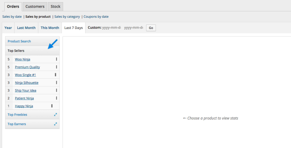 你可以从商店中选择任何产品以查看销售数据,并再次深入到按年、上个月、本月、过去7天以及自定义。