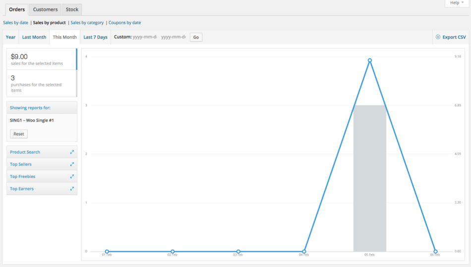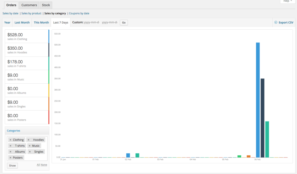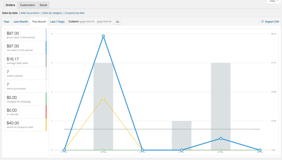 WooCommerce的报表,让你能使用图表和统计资料看到你商店每月的业绩。它有四个部分:订单、顾客、库存、税。